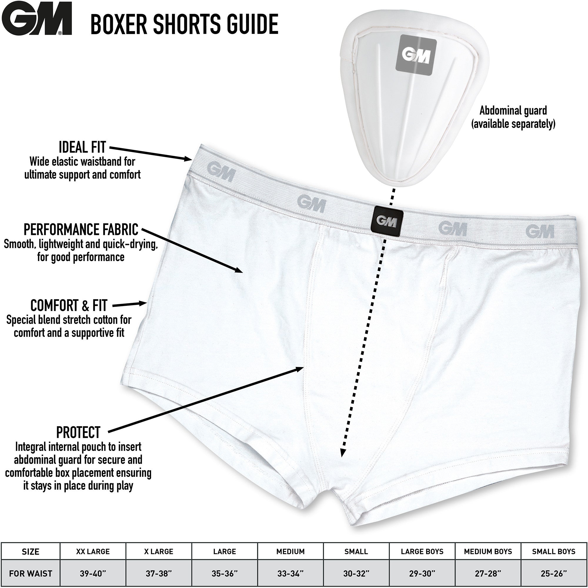 PROTECT - Integral pouch to insert abdominal guard for secure and comfortable box placement ensuring it stays in place during play. All GM abdominal guards can be used