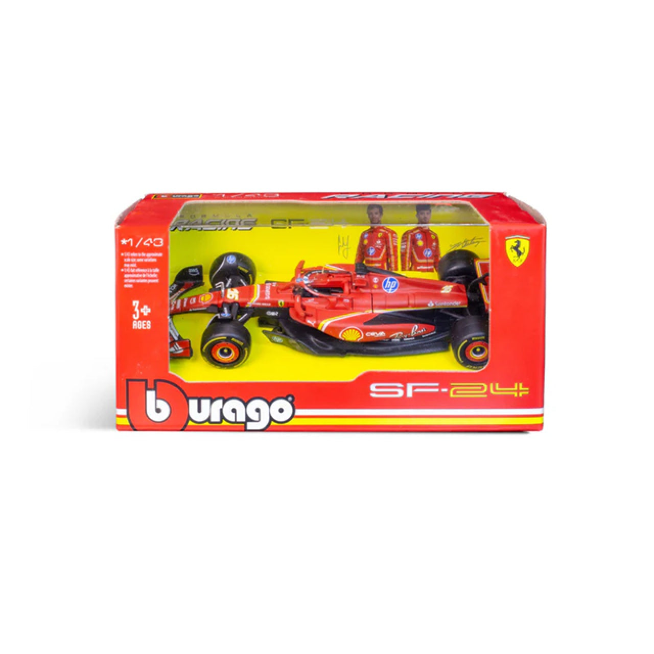 This 1:43 scale Ferrari SF-24, featuring Charles Leclerc's livery, making it ideal for retail display. It features precise detailing, from the car's aerodynamic structure to the sponsor logos, making it a perfect collectible for any Ferrari fan.